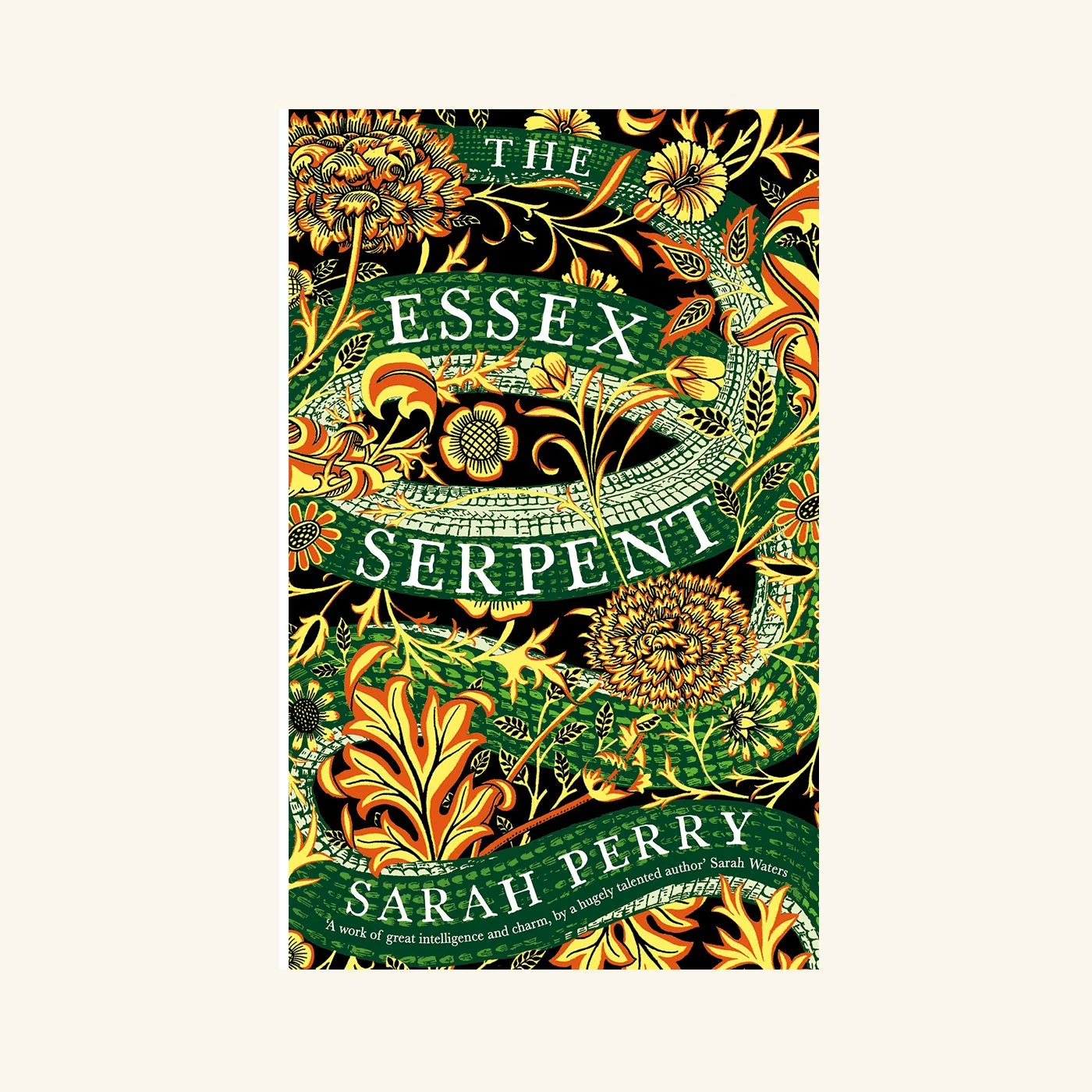 • A white-framed book cover featuring a print of green snakeskin and orange and yellow flowers